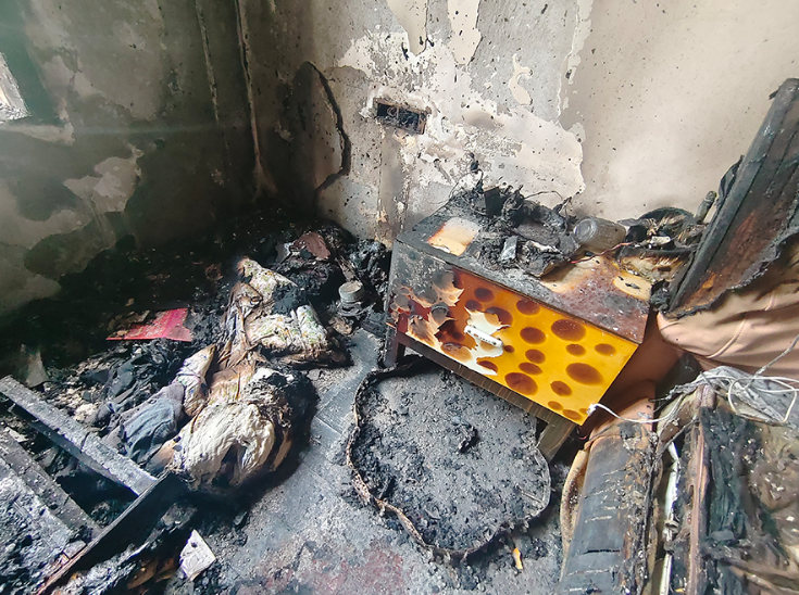 電蚊香的正下方,放置有一個收納盒、一床棉被、衣物。發生火災的當晚家中無人,共造成臥室沙發、床及空調等被燒毀,客廳及餐廳墻面均被濃煙熏黑。