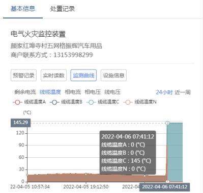 2022年04月06日07點41分04秒,蘭山街道智慧消防中心(以下簡稱“中心”)一級平臺接收到顏家紅埠寺村五網格振輝汽車用品商鋪中安裝的智慧用電設備發出的溫度預警。