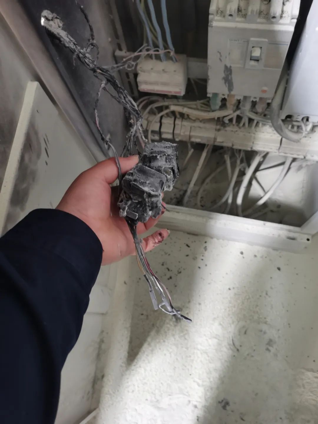 當中心巡檢人員抵達現場時,老板正在處置,隨即巡檢人員協助老板處置,發現該商戶配電箱內空開與電線已經燒焦。